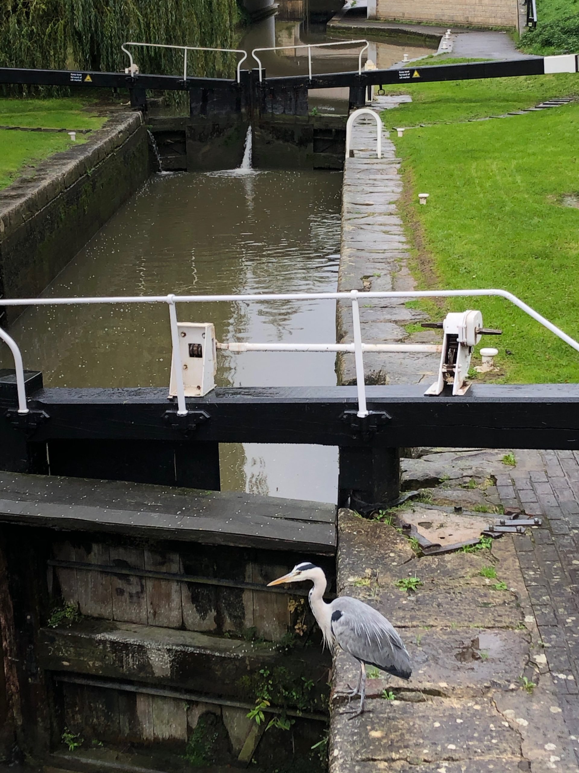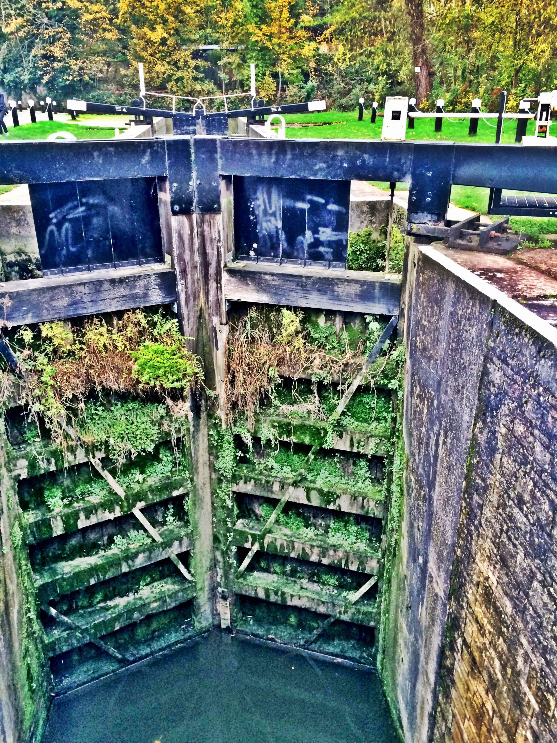 Climb the stairs at the side of the second lock and turn right to walk over the bridge and along the path next to Deep Lock. These gates are sometimes covered in Tolkienesque foliage. The Canal and River Trust clean them periodically by closing the locks and draining the water out. [I’m a Friend of the Trust, a wonderful organization that maintain the waterways for all to use. Definitely check them out if you plan to walk more of the canal network.]
