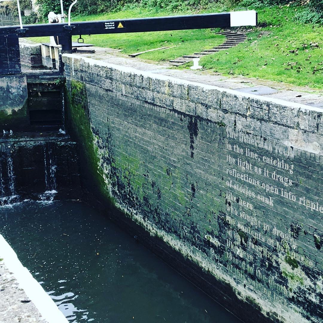 Keep an eye out in the following locks, as there is some poetry below the high water line. You can also look up to the allotments on the right-hand bank.